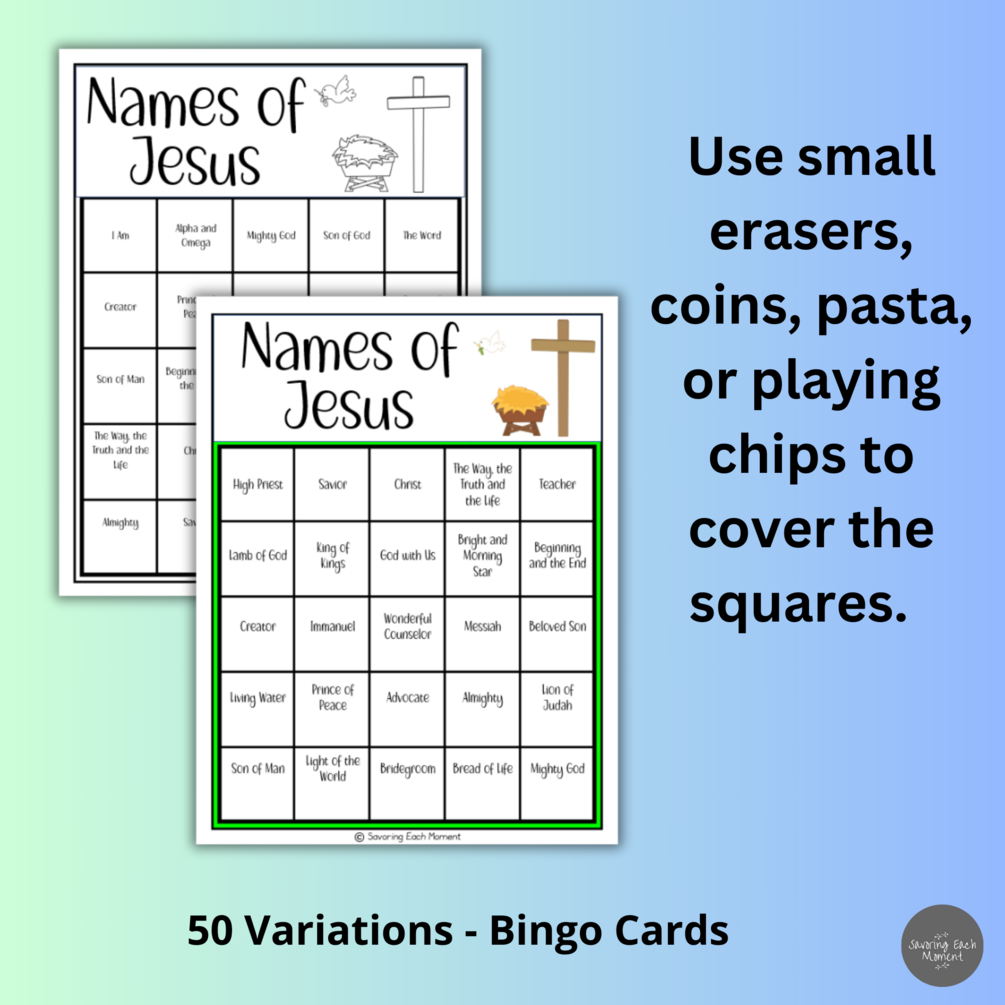 Names of Jesus Bingo Game Cards (50 different cards in black and white as well as color)