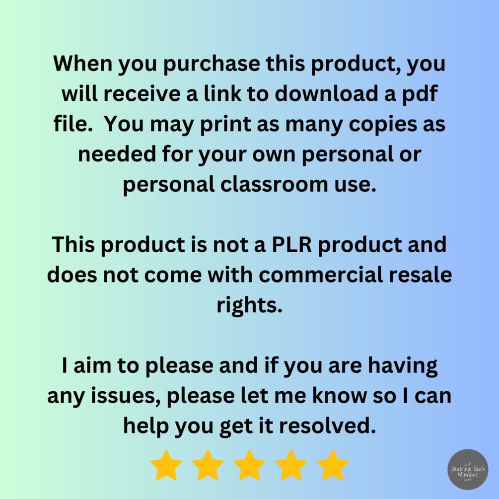 This printable is for your personal use only. This includes your personal classroom. It does NOT include any commercial rights for resell or PLR.