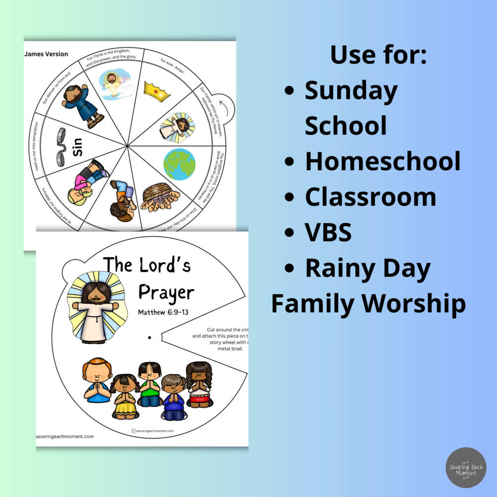Use this Lord's Prayer Story Wheel in your Homeschool activities, in your classroom as a printable activity to reinforce your child's learning about the way Jesus taught us to pray.
