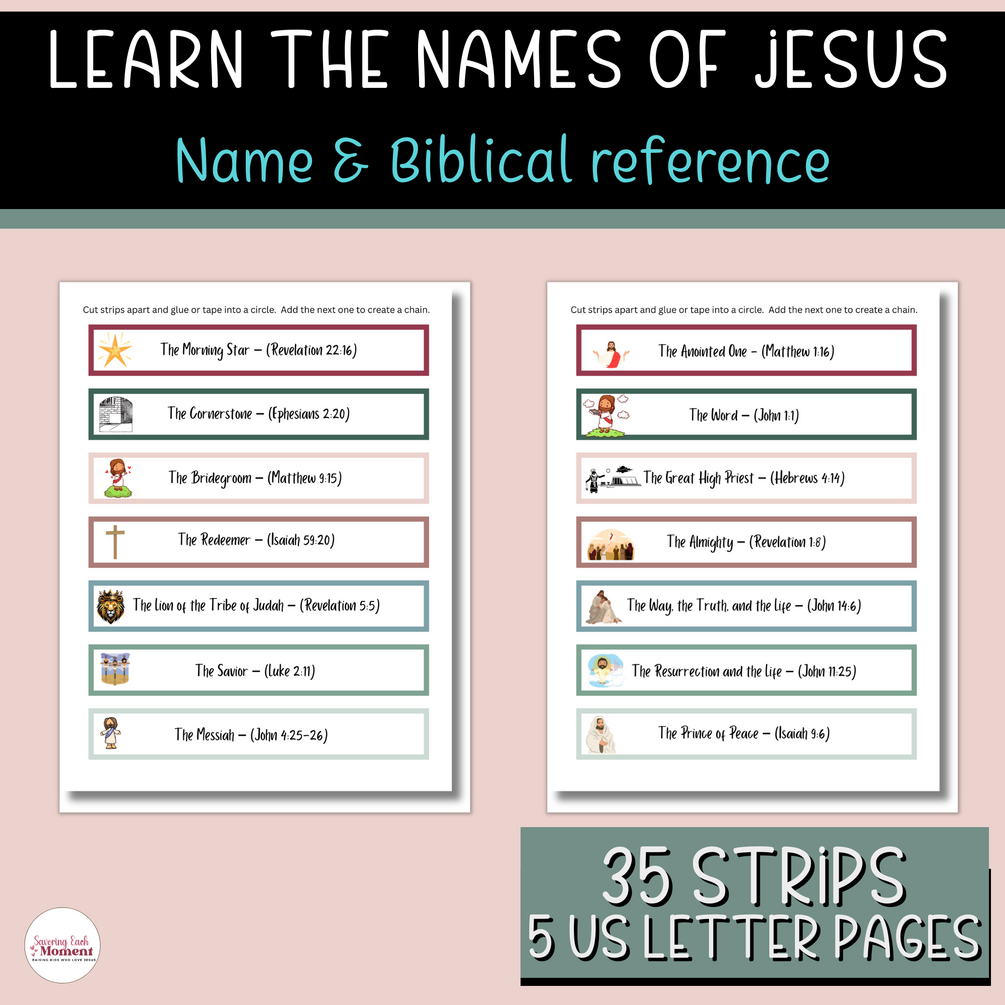 This printable Names of Jesus Advent paper chain activity is simple to use. It is a great printable Bible activity to supplement or compliment a kids Bible lesson on the names of Jesus. You can also use this as a Bible verse memorization tool or countdown or count up chain to Christmas or Easter.