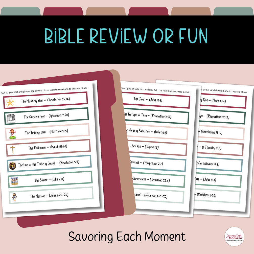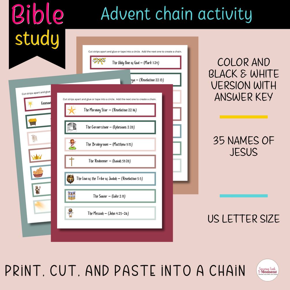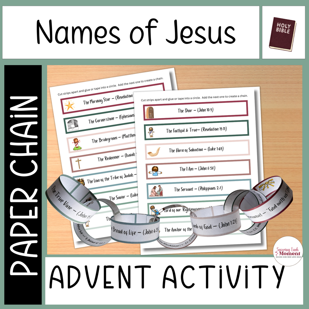 This printable Names of Jesus Advent paper chain activity is simple to use. It is a great printable Bible activity to supplement or compliment a kids Bible lesson on the names of Jesus. You can also use this as a Bible verse memorization tool or countdown or count up chain to Christmas or Easter.