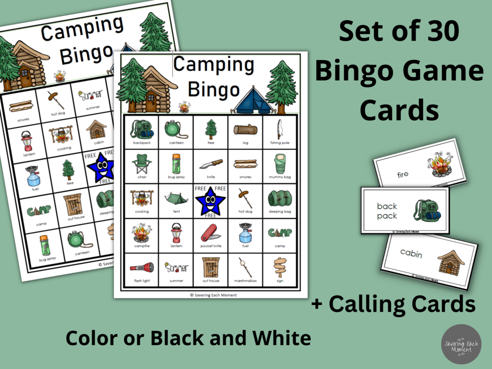 The Camping Bingo game comes with 30 variations of the bingo card and also comes in black and white to save ink as well as in color. 30 versions in each set. You will also receive a set of calling cards in color as well as black and white.