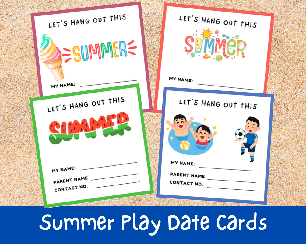 A pdf file with four different variations of the summer play date cards with 6 cards on each US letter sized page.
